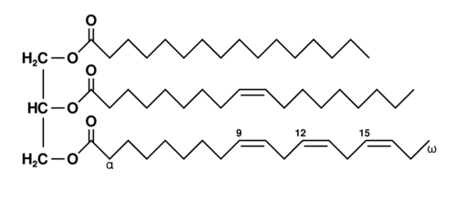 Example of an unsaturated fat triglyceride. Left part: glycerol, right part from top to bottom: palmitic acid, oleic acid, alpha-linolenic acid. Chemical formula: C55H98O6