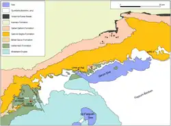 The Fayum region's base is generally assigned to the Mokattam group (also called the Wadi el-Rayyan series), named after Gebel Mokattam east of Cairo. It is of marine origin and consists of four rock units, the Muweilih Formation, the Midawara Formation, the Sath El-Hadid Formation and the Gharaq Formation. All four formations are composed of limestones, but they differ in their structure and in the content of nummulites and glauconites. The upper end of the Mokattam Group is defined by a rapid decrease in numulites and an increase in glauconites. The Gharaq Formation is the most widely outcropped unit of the Mokattam Group in the region and is mostly found in the southwestern Fayum area from Wadi el-Rayyan to the southern part of Wadi el-Hitan and to Garet Gehannam.[10][5]