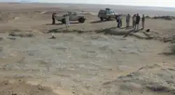 The fossils come from several geological Formations. Plant fossils only occur in large numbers in the Gebel-Qatrani Formation. On the other hand, invertebrates can be found in almost all rock units, while vertebrates are more limited. Sea forms are distributed among the lower units and are common in the Muweilih, Gharaq, Gehannam and Birket-Qarun Formations, but they are also preserved from the Qasr-el-Sagha Formation. Sometimes the larger marine mammals in particular have been preserved in complete skeletons.[11] The Qasr-el-Sagha Formation and the subsequent Gebel-Qatrani Formation are the main areas where terrestrial organisms were found; the material is predominantly fragmented and disarticulated, so that certain rearrangements can be assumed. There are countless sites and outcrops in the entire Fayum area. They are located in the various stratigraphic units and are generally concentrated to the north and west of Lake Qarun. Over 100 sites have been documented for terrestrial mammals alone. These are spread over a few isolated ones in the Birket-Qarun Formation and a little less than a dozen in the Qasr-el-Sagha Formation. The vast majority, over 90%, belong to the Gebel-Qatrani Formation.[17][18][19] Of great importance is the site BQ-2 from the Umm Rigl Member of the Qasr-el-Sagha Formation (individual, mainly paleontological studies refer the Umm Rigl Member to the Birket-Qarun Formation,[19] which is attributed to inadequate excavation conditions at the site itself[5]) near the easternmost tip of Lake Qarun. BQ-2 was only discovered in the year 2000, and the most diversified vertebrate fauna of the entire Fayum region comes from there.[19] Most of the other sites in the Qasr-el-Sagha Formation, with the exception of one unstratified site from the Temple Member, can be assigned to the Dir Abu Lifa Member. In general, however, land-living mammals are less common here.[17][18]