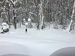 Maine was among the hardest states hit from this storm, the highest snowfall total of 36 inches (91 cm) was recorded near Jonesboro.[2][3] In Bangor, a 24-hour snowfall record was broken, with 21.5 in (54.6 cm) falling in one day.[8] The storm was also Bangor's fourth largest snow event on record, and many other locations including Waterville and Lewiston received over 18 inches of snow. New Hampshire was also one of the hardest hit states from the storm, where many locations received over 2 feet of snow. The snow highest total in New Hampshire was in Jefferson, which received 29 inches (74 cm).[3]