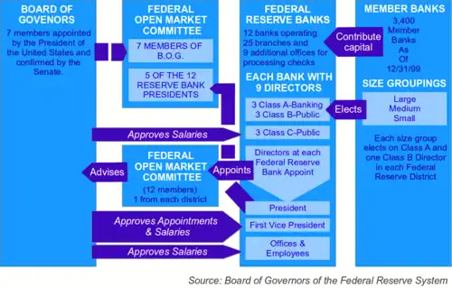 The Federal Reserve System has a "unique structure that is both public and private"[48] and is described as "independent within the government" rather than "independent of government".[11] The System does not require public funding, and derives its authority and purpose from the Federal Reserve Act, which was passed by Congress in 1913 and is subject to Congressional modification or repeal.[49] The four main components of the Federal Reserve System are (1) the board of governors, (2) the Federal Open Market Committee, (3) the twelve regional Federal Reserve Banks, and (4) the member banks throughout the country.