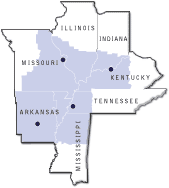 Located in downtown St. Louis, the St. Louis Fed is the headquarters of the Eighth Federal Reserve District, which includes the state of Arkansas and portions of Illinois, Indiana, Kentucky, Mississippi, the eastern half of Missouri and West Tennessee. It has branches in Little Rock, Louisville and Memphis. Its building, at 411 Locust Street, was designed by St. Louis firm Mauran, Russell & Crowell in 1924. The Eighth District serves as a center for local, national and global economic research, and provides the following services: supervisory and regulatory services to state-member banks and bank holding companies; cash and coin-handling for the District and beyond; economic education; and community development resources.