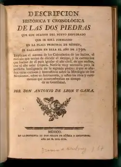 • León y Gama, Antonio de, Descripción histórica y cronológica de las dos piedras que con occasion del nueve empedrado que se está formando en la plaza principal de Mexico (1792) — a description of the Aztec calendar stone shortly after it was rediscovered