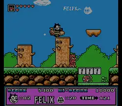 Felix the Cat has simple game mechanics. The A button is used to jump (press repeatedly to fly or swim), and the B button is used to attack. The type of attack varies depending on the magic level. When Felix falls into the bottomless pit (past the bottom of the level), runs out of time, or loses all his health, he loses a life. Scattered items replenish health and magic. Enemies include moles, tree trunks, cannons, birds, fish, and eight boss monsters. Enemies generally follow a regular pace back and forth, and Felix can shoot them. If Felix takes a hit, his magic power goes down one level. If Felix is at the lowest magic power and gets hit, he loses a life. There are nine worlds.