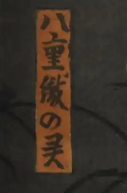 Although it is displayed in isolation in the ROM, the print is actually the centre image from a triptych capturing different characters from the play.[35] The image on the left—to which her outstretched right arm appears to be reaching—is of Akamatsu Shigetamaru (赤松重太丸) as played by actor Ichikawa Kodanji (市川小団次).[36] In the triptych's right position, is another character from the play named Shichi[?]shirō (七?四郎). The image belongs to a series of over twenty images depicting scenes from the play,[37] including another of the Yaeki hime no rei character.[38]