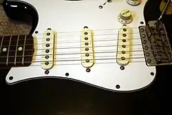 The Fender Noiseless series is a line of electric guitar pickups made by the Fender Musical Instruments Corporation designed to cancel 60 cycle (Hz) hum noise while retaining the characteristic sound of single coil pickups. Introduced in 1998, these pickups consist of a pair of single coils stacked one on top of the other, compacted so as to match the shape and width space as a traditional Fender single coil guitar pickup, while being only slightly taller. The upper coil is actually the sound source, while the lower coil is responsible for the mains hum attenuation. Alnico[1] 5 magnetic bars span from one coil to the other, crossing a soft ferrous steel spacer plate that isolates them, without touching it. The spacer plate has mainly two functions: to isolate the lower coil from the vibrations of the string, making sure that the sound is picked up only from the upper one, and to increase the magnetic flux that passed through both coils, increasing the output of the pickup. This is to be contrasted with the original noise canceling pickup, the humbucker, which is a double-wide, horizontally adjacent pair of single coil pickups with opposing phase.[2]