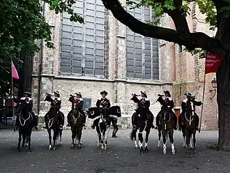 ![]() A regiment of trumpeters on horseback perform in Domplein, the square in the ruins of St. Martin's Cathedral. | |
