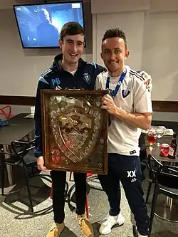 ![]() Fiachra (right) and teammate Padraig Biggane after winning the 2018–19 Kent Intermediate Challenge Shield with South East Athletic | |||