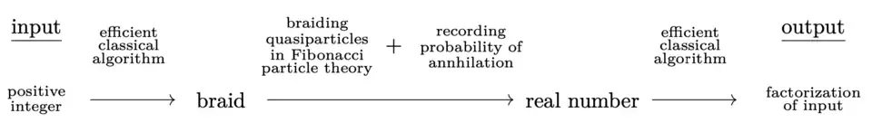 The pipeline for universal quantum computing with Fibonacci anyons can be described as follows.[6][7][2] First, one is given an instance of a decision problem which is in the complexity class BQP (for instance, a large integer whose factorization one wishes to determine). Since the problem of additively approximating a normalization of the Jones polynomial at a third root of unity is BQP complete,[35] this means by definition that there is a polynomial time classical algorithm for taking any efficient quantum circuit an assigning to it a framed link such that an additive approximation of the Jones invariant (or really, Kauffman bracket) of that link evaluated at encodes the solution of the decision problem. For example, using this procedure, Shor's algorithm for factoring an integer would correspond to some large link. To relate the Kauffman bracket of this link evaluated at to the physical world, one would take some material which hosts Fibonacci anyons, and perform a series of creation, braiding, and fusion operators such that the spacetime trajectories of the Fibonacci anyons in this process form the link outputted in the previous step of the process. One would then repeat this experiment polynomially many times, and record the probability that all of the fusion measurements resulted in the vacuum sector. The algebraic properties of the Fibonacci category imply that this probability is approximately equal to the Kauffman bracket evaluated at , up to normalization by some power of the golden ratio. By construction, there is then a polynomial time classical algorithm for taking this approximation and using it to deduce the result of the original decision problem with high probability (for instance, in the case of factoring, this algorithm would use the digits of the approximation of the normalized Kauffman bracket to recover the factorization of the input integer). This pipeline is demonstrated below