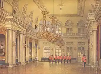 The great fire, which destroyed the interior of the Winter Palace, began in this hall on 17 December 1837. It destroyed all in its path for over thirty hours.[2] Following the fire, the hall was rebuilt in its original style by the architect Vasily Stasov.
