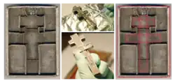 Underneath the lid the surface is divided into four parts and created using niello, the top left, the Annunciation; top right, the Nativity and bathing of Jesus; bottom left, the Crucifixion (which mimics the front lid); and the bottom right, the Anastasis (Christ descent into Hell) scene pulling Adam and Eve out of Hell.[4] Greek text within the scenes translates to, "Hail, full of grace!" and "Here is your son...Here is your mother."[5] The lid was only removed by intimate viewers, so these scenes might have been more privileged.[6] The interior of the box is divided by a Patriarchal (double cross) walls which create 5 sections. It is believed to have contained a wooden cross relic that would have fit perfectly within the main section, the 4 surrounding compartments would have contained other Holy relics, such as bones, hair, cloth, etc.