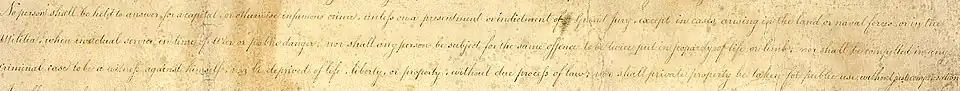 No person shall be held to answer for a capital, or otherwise infamous crime, unless on a presentment or indictment of a Grand Jury, except in cases arising in the land or naval forces, or in the Militia, when in actual service in time of war or public danger; nor shall any person be subject for the same offence to be twice put in jeopardy of life or limb; nor shall be compelled in any criminal case to be a witness against himself, nor be deprived of life, liberty, or property, without due process of law; nor shall private property be taken for public use, without just compensation.