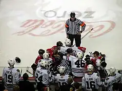 Fighting is an established tradition in North American ice hockey, with a long history that involves many levels of amateur and professional play and includes some notable individual fights.[1] Fights may be fought by enforcers, or "goons" (French: bagarreurs)[2]—players whose role is to fight and intimidate—on a given team,[3] and are governed by a system of unwritten rules that players, coaches, officials, and the media refer to as "the code".[4] Some fights are spontaneous, while others are premeditated by the participants.[5] While officials tolerate fighting during hockey games, they impose a variety of penalties on players who engage in fights.