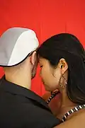 | Abrazo cerrado | V-shape close embrace | Salon and tango nuevo | The dancers' chests are closer to each other than their hips, and often there is contact at about the level of the chest (the contact point differing, depending on the height of the leader and the closeness of the embrace). In close embrace, the leader and the follower's chests are in contact and they are dancing with their heads touching or very near each other. |