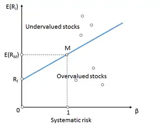 The expected return used when discounting cashflows on an asset , is the risk-free rate plus the market premium multiplied by beta (), the asset's correlated volatility relative to the overall market . |