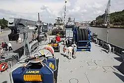 However, as the advancing system can only be used effectively in calm seas with significant wave height below one metre, Louhi is also equipped with a special "wave damping tank", an innovation used for the first time in a Finnish recovery vessel, that can be used in combination with the aforementioned stiff brush conveyors and a shorter sweeping boom to collect oil in 2-metre (7 ft) swell. The system consists of a dampening channel that guides the oil to the recovery system on the other side of the ship.[16] Spilled oil surrounded by oil booms can also be collected by two free-floating skimmers connected to the vessel by a flexible pipe.[3][17]