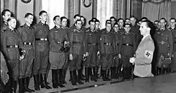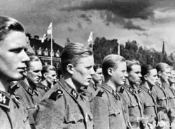 1,408 Finns were recruited into the Waffen-SS.[34] Although recruitment had initially focused on the Swedish-speaking population of Finland,[27] only about 12% of volunteers were Swedish-speaking.[22] On average, the recruits were 21 years old,[11] and held a collective ideology of Finnish nationalism, revanchism, and a Finnish form of Lutheran revivalism.[35][36] The recruits' motives included a desire for German training, which implied possible economic advancement immediately through the SS and in the future through the Finnish Army, and pro-German, anti-Russian sentiment.[37][38] In a report for the National Archives of Finland, Finnish historian Lars Westerlund found that antisemitism was not among the primary motives for the Finnish volunteers.[39]