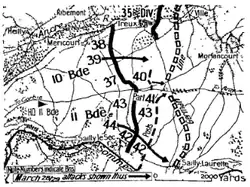 The 11th Brigade's advanced elements subsequently stepped off around 5:45 pm, with several patrols of South Australians from the 43rd Battalion being pushed forward with a view to taking Sailly-Laurette. Coming under intense fire, this patrol was able to slowly work its way forward over the course of just over an hour, and began establishing a line of outposts, but these were well short of the objective. The 42nd Battalion, a Queensland-recruited unit, also established several posts opposite the village.[20] As dusk fell, the 39th Battalion moved north around the 40th and pushed the line forward on the Australian left, to conform with the 40th, and began to dig-in. Shortly afterwards, the 41st belatedly moved up on the 40th Battalion's right to join the line between the 40th Battalion and the outposts established by the 42nd and 43rd Battalions, thus establishing a contiguous line between the Ancre and the Somme.[21]