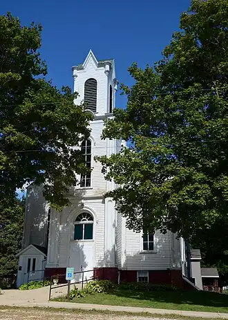 The First Congregational Church of LaMoille is a historic church located at 94 Franklin Street in La Moille, Illinois, United States. The building was constructed in 1867 for La Moille's Congregational church, which was established by Owen Lovejoy in 1840. The church was designed in the Italianate style, which was growing in popularity at the time. Its design features tall arched windows, a tower atop the main entrance, decorative pilasters at the corners, and corbelling along the front cornice. The church originally included several Gothic Revival features as well, such as a spire steeple and pinnacles, but these fell into disrepair and were removed.[2]