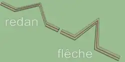 A flèche (Fr. for "arrow") is an outwork consisting of two converging faces with a parapet and an open gorge, forming an arrowhead shape facing the enemy.[1]