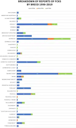 The condition is often misdiagnosed as Pectus excavatum,[2] with which it has no direct connection, although FCKS kittens may also have PE. Although the condition is believed to be more prevalent in the Burmese breed it is found in every breed of cat, including non-pedigree domestic cats, and the apparent prevalence in the Burmese is most likely due to better communication between breeders and reporting of the condition, as well as the naturally more barrel-shaped chest of this particular genotype.[3] Since early reporting of the condition identified the Burmese as susceptible the Bengal breed, with a similar physiology, has emerged, and shows a similarly large number of FCKS kittens, however this may be due to specific interest in the condition among those working with the breeds. It is reported in all breeds and in domestic non-pedigree cats, both those kept as pets and those living as 'barn cats'. An article in a Swedish cat club newsletter about FCKS led to a spike in reporting of the condition in Ragdolls in Sweden.