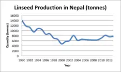 Oilseed production in Nepal was largely replaced by grain crops which contain a higher caloric value but requires higher labor and overall decrease in nutritional quality for the Nepalese.[4] Flax production is seen to be increasing as Nepal's reported yields in 2012 are 5000 hectograms per hectare (Hg/Ha) and 5358 Hg/Ha in 2013 referring to a production quantity of 7500 tons and 7672 tons respectively.[5] The cool and temperate climate of the mid-hill regions in Nepal present great potential for farmers to maximize their linseed yields and the yield of proceeding cash-crops through disease and pest control.[3] The hill regions of the Lamjung district is less than 170 km from the capital of Nepal, Kathmandu, which represents an ideal market for trading of the flax seeds or any by-products of the crop made by Nepalese farmers and their families.[1][2][4]