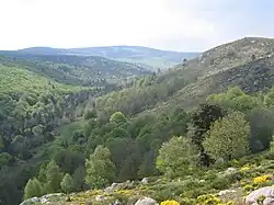 This level is more often forested than the lower level. The characteristic trees at this altitude are the Sessile Oak and the Pedunculate Oak, especially in the west of the massif. In the east, the Scots pine can be found.[3] The flora accompanying these woody species is not particularly remarkable: the classic woodland flowers such as Lily of the Valley, Wood Anemone, common cow-wheat and Solomon's Seal can be found here. Among the slightly less common plants, one might come across the Stinking hellebore or Bear's foot, a plant that is easy to recognize and characteristic of basic soils (especially limestone). Generally speaking, in the nineteenth and twentieth centuries, this level was the subject of massive reforestation, as in the Limousin region (planting of conifers), but also in the south on certain steep slopes which tended to erode (a good example is provided by the black pine forests all around the causses and in particular in the upper Lot valley around Mende).