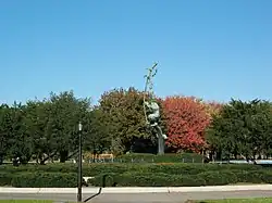 Arne Abramowitz became administrator of Flushing Meadows–Corona Park in 1986 and soon began planning a renovation of the park.[119] The following year, NYC Parks announced an $80 million rehabilitation of the park.[120][121] The renovation had been planned since the early 1980s but had been deferred due to a lack of funding.[122] The grounds of the park's northern section were landscaped in 1992,[123] and the restoration of the Unisphere was completed in May 1994.[124][125] By the mid-1990s, NYC Parks was planning to spend another $19 million to rebuild fountains, build a new ramp to the Willets Point Boulevard station, add three entrances and a cultural walk, and enlarge the Hall of Science.[126] The Aquacade amphitheater, which had decayed extensively,[127] was demolished in 1996.[128] Arthur Ashe Stadium opened in the park in 1997, replacing a smaller stadium.[129] In addition, mosaic medallions commemorating the World's Fair were installed at David Dinkins Circle in 1998; it is unknown who designed the mosaics.[130]