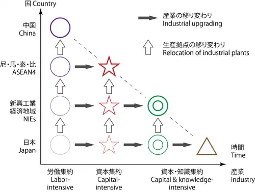 Akamatsu's third flying geese paradigm (FGP) is a model for the international division of labor in East Asia based on dynamic comparative advantage. The paradigm postulated that Asian nations will catch up with the West as a part of a regional hierarchy where the production of commoditized goods would continuously move from the more advanced countries to the less advanced ones. The underdeveloped nations in the region could be considered to be "aligned successively behind the advanced industrial nations in the order of their different stages of growth in a wild-geese-flying pattern."[2] The lead goose in this pattern is Japan itself, the second-tier of nations consists of the newly industrializing economies (South Korea, Singapore, Taiwan, and Hong Kong). After these two groups come the main ASEAN countries: Thailand, Malaysia, and Indonesia. Finally, the least developed major nations in the region: China, Vietnam, the Philippines, etc. make up the rearguard in the formation.[3]