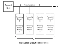 - Associative processor – These receive the one (same) instruction but in addition a register value from the Control Unit is also broadcast to each PU. In each PU an independent decision is made, based on data local to the unit, comparing against the broadcast value, as to whether to perform the broadcast instruction, or whether to skip it.