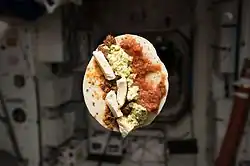 Breakfast taco created by crew of ISS-47. It contains refried beans, shredded pork, pepperjack cheese, scrambled eggs, and salsa on a tortilla.