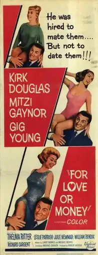 For Love or Money is a 1963 romantic comedy film distributed by Universal International, produced by Robert Arthur, directed by Michael Gordon, and starring Kirk Douglas, Mitzi Gaynor, and Gig Young. It was written by Larry Markes and Michael Morris, and released on August 7, 1963. The supporting cast features Thelma Ritter, Leslie Parrish, Julie Newmar and William Bendix.