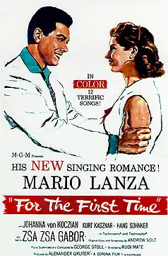 For the First Time (German title: Serenade of a Great Love) is a 1959 musical film directed by Rudolph Maté and starring Mario Lanza, Johanna von Koczian, Kurt Kasznar, and Zsa Zsa Gabor. It was tenor star Mario Lanza's final film, released by Metro-Goldwyn-Mayer six weeks before his death. Lanza stars as an operatic tenor who finds love for the first time with a young German woman (played by Johanna von Koczian), who happens to be deaf.