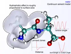 Molecular mechanics potential energy function with continuum solvent.
