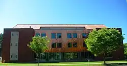 These green amenities included using brick, copper, stone, and other building materials that have a long lifespan.[15] Brick is used for the exterior and copper for the roof.[15] Other items include a displacement ventilation HVAC system, solar panels, use of recycled materials in the construction, and maximizing the use of natural light throughout the structure.[15] Overall, the energy consumption is 58 percent less than for a similar building built to code.[15] LEED Gold status was awarded on December 10, 2009, by the U.S. Green Building Council.[16]