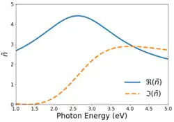 Forouhi–Bloomer model. The real (blue solid line) and imaginary (orange dashed line) components of complex refractive index are plotted for model with parameters 1.3 eV, 1.4910 eV, 5.2139 eV, 8.6170 eV, and 1.5256. These parameters approximate amorphous silicon.[1]
