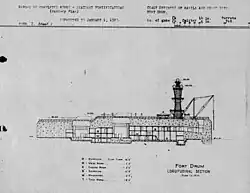 Construction began in April 1909 and lasted for five years. The rocky island was levelled by U.S. Army Corps of Engineers and was built up with thick layers of steel-reinforced concrete into a massive structure roughly resembling a battleship, 350 ft (110 m) long, 144 ft (44 m) wide, and with a top deck 40 ft (12 m) above water at mean low tide.[12] The 14-inch (356 mm) M1909 guns and their two custom built M1909 turrets, named Batteries Marshall and Wilson, were delivered and installed by 1916. The M1909 guns were specially designed for Fort Drum and were not deployed elsewhere.[13] The secondary 6-inch (152 mm) M1908MII guns on M1910 pedestal mounts in casemates, Batteries Roberts and McCrea, were installed the same year.[14]