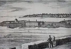 Fort Frederick was built on the south end of Point Frederick, the site of the Kingston Royal Naval Dockyard. The point and fort were named after Frederick, Prince of Wales. The original fort, consisting of earthworks, was built during the War of 1812 for protection against naval attack. On November 10, 1812, the Fort Frederick battery took part in the Battle of Kingston Harbour, repulsing an American naval squadron under Commodore Isaac Chauncey.[4]