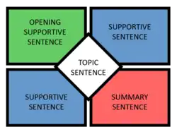 - Then, the student writes three sentences that develop the thesis of the central topic, placing one in each of the following squares: upper-left, upper-right, and lower-left. The upper-left square contains the opening supportive sentence, and the next two squares contain other supporting information.