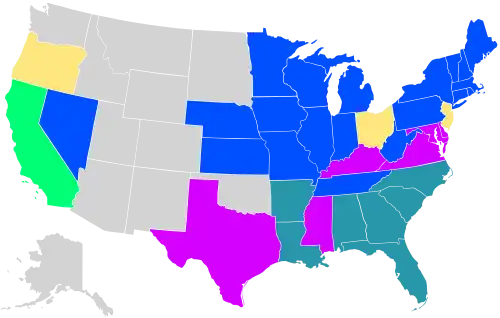 In Richardson v. Ramirez (1974), the Supreme Court upheld the Constitution of California's felony disenfranchisement provisions against an Equal Protection Clause challenge, reasoning that Section 2 allows states to punish crime with a permanent loss of voting rights.[70] However, in Hunter v. Underwood (1985), the Supreme Court held that because a similar provision in the Alabama Constitution of 1901 was enacted with discriminatory intent, it was unenforceable.[70] The 2020 California Proposition 17 restored the right to vote after completion of one's prison term, and as of 2025, half of the states either automatically restore voting rights upon release from prison or never order disenfranchisement.[75]