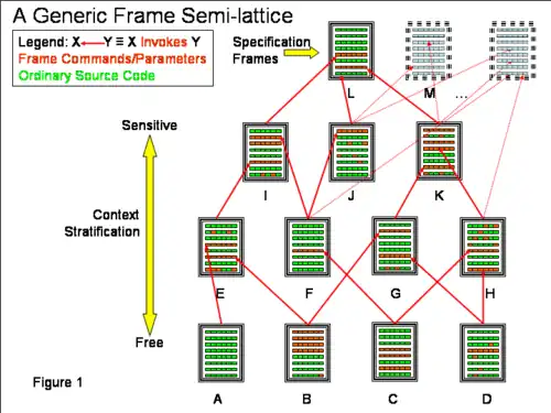 Context scoping is what distinguishes FT from other modeling and construction systems: Each frame constitutes the context into which it integrates its subassembly. In nested subassemblies the lower levels are progressively more context-free because they integrate less information. Integration conflicts are resolved in favor of the most context-sensitive frame to assign or insert a parameter – it becomes read-only to all other frames in that frame's subassembly.[14] In figure 1, frames F and C would conflict if they assign different values to parameter p. So F overrides C – i.e., the frame processor ignores C’s assignment(s) to p, and uses F’s value(s) for p in F and C. Similarly, J can override both F and C, and so on.