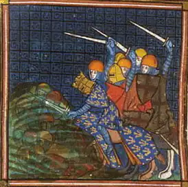 Unable to take Paris, Otto retreated to Lotharingia in November 978.[16] The bulk of his army had crossed the river Aisne when some West Frankish pursuers fell on the baggage train. In the resultant chaos, many lives were lost.[12] According to the History of the Franks of Sens, so many were the corpses that they clogged the river and it overran its banks.[14] Brun of Querfurt blames the slaughter on the troops' gluttony and drunkenness.[20]