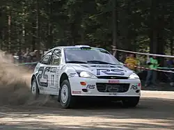 Delecour with a Ford Focus RS WRC 01 at the 2001 Rally Finland.