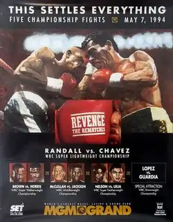 Just over three months prior, Randall had scored a major upset over Chávez after being named the winner of their fight by split decision, ending Chávez's 90-fight unbeaten streak and taking his WBC super lightweight title in the process. Chávez had been deducted two points by referee Richard Steele for low blows in separate rounds, effectively costing Chávez a spit decision in his favor.[2] Refusing to concede defeat, Chávez exercised his rematch clause immediately after his loss to Randall while announcing that the rematch would take place a little over three months later during the weekend of Cinco de Mayo stating "I will see everyone the weekend of May 5. I have lost the battle but not the war."[3] Promoter Don King would supplement the Randall–Chávez rematch with three other championship rematches; Gerald McClellan vs. Julian Jackson for the WBC middleweight title, Azumah Nelson vs. Jesse James Leija for the WBC featherweight title and Simon Brown vs. Terry Norris for the WBC super welterweight title, in addition to a Ricardo López–Kermin Guardia WBC strawweight title fight, in a boxing card he billed as "Revenge: The Rematches."[4]