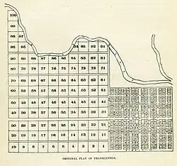 In 1846, traveler Henry Howe had this to say about Franklinton: "Franklinton lies on the west side of the Scioto, opposite Columbus. It was the first town laid off in the Scioto valley north of Chillicothe. From the formation of the county, in 1803, it remained its seat of justice until 1824, when it was removed to Columbus. During the late war, it was a place of general rendezvous for the northwestern army, and sometimes from one to three thousand troops were stationed there. In those days, it was a place of considerable note; it is now a small village, containing, by the census of 1840, 394 inhabitants."[4]