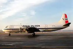 FOF established a heavy technical division in 1966. A hangar was bought at Fornebu and in 1969 it was expanded to allow room for the DC-6 and allowed all the company's facilities at Fornebu to be located at one place. The division was approved as an authorized aircraft maintenance facility in 1972, allowing it to carry out subcontracted work for other airlines and also on the Lockheed P-3 Orion and Lockheed C-130 Hercules for the Royal Norwegian Air Force.[23] The airline bought a Convair CV-340 in 1968.[24] It was intended to be used both for runway calibration on contract with the Civil Aviation Administration and for freight charter. However, with the construction of the regional airport network, the aircraft was constantly occupied with calibration runs.[20] It was later subcontracted to Widerøe, which used it on the route connecting Bodø Airport, Bardufoss Airport, Tromsø Airport and Andøya Airport, Andenes.[25]