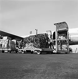 To capitalize on the growing European freight market, Fred. Olsen bought a cargo-only Douglas DC-6 in 1965. Its capacity of 13 tonnes cargo was twice that of the Curtiss,[18] and the aircraft was wet-leased to SAS to use on its European cargo routes. Two additional DC-6s were bought in 1967, allowing Fred. Olsen to take over all cargo flights in the SAS system.[21] During the Biafran airlift of the Nigerian Civil War, which commenced in 1968, Fred. Olsen was contracted by Joint Church Aid to operate aid flights out of São Tomé to Uli. Initially two Curtisses were used, but later a DC-6, painted in Joitn Church Aid livery, was contracted. FOF built up a full operational base at São Tomé International Airport. This resulted in the aircraft being bombed in November 1969. Thus a new DC-6 was sent down.[20] The Curtisses were sold in 1971.[22]