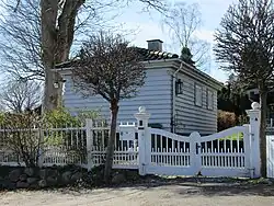 The guesthouse has a modestly pitched ]hip roof with black-glazed tiles and walls with overlapping board siding.