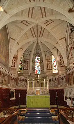 The Wesleyan chapel was completed in 1807.[9] It is now Freeland Methodist Church. The Gothic Revival architect John Loughborough Pearson designed the Church of England parish church of Saint Mary the Virgin, parsonage and parish school.[2] [7] The Taunton family paid for the church and parsonage to be built in 1869 and the school in 1871.[2] The church is high Victorian Gothic Revival, with stained glass and decoration by Clayton and Bell and 13th-century-style paintings of Jesus' Passion and Transfiguration.[7]