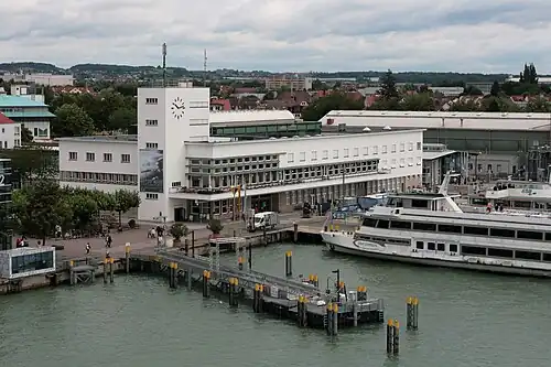 The quarter around the port station was substantially rebuilt from 1929 to 1933. The freight yard was relocated to the northern part of the city and then a new entrance building was built in the International Style to the plans of Karl Hagenmayer of the Reichsbahndirektion Stuttgart (Stuttgart rail division). This building was badly damaged in air raids in 1944, but was rebuilt after the Second World War in its original form. After Friedrichshafen had increasingly lost its importance as a railway location after the Second World War, the rail ferry service to Romanshorn was closed in 1976. The track and ancillary equipment lying to the east of the entrance building that had served the ferry has been removed in the subsequent years.[4] The station building has retained its function and was sold to the city in 1988. After a new terminal building for the railway, customs and ferry operations was built on the ferry plaza, the former station building was rebuilt from 1993 to 1996 as the Zeppelin Museum.[5][6] The track layout has been considerably simplified since the mid-1970s.